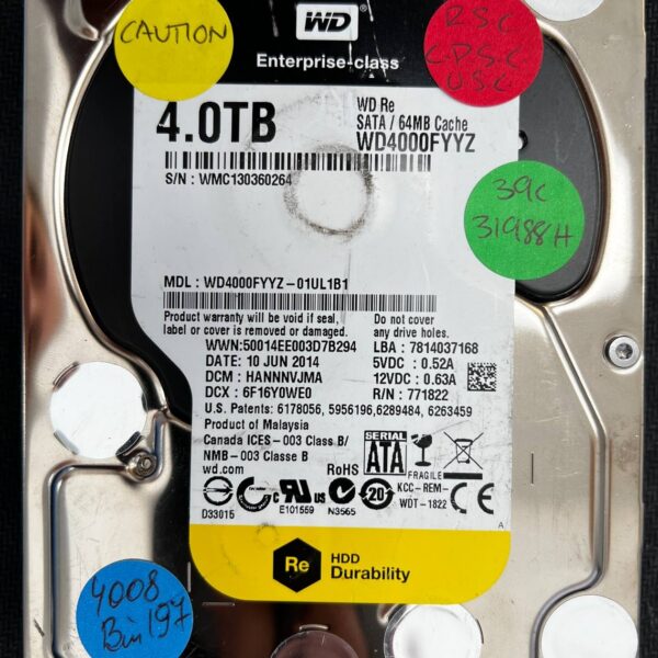 Full File Name: WESTERN DIGITAL WD4000FYYZ WMC130360264 2014-06-10 4TB HDD Brand: Western Digital Series: WD Re (Enterprise Class) Drive Type:...