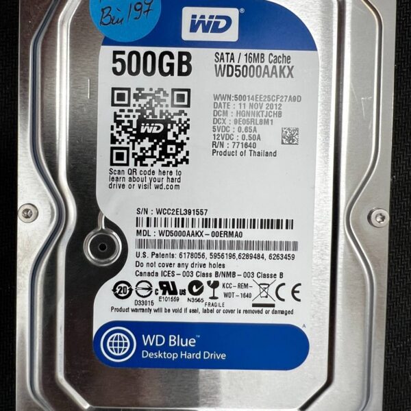 Full File Name: WESTERN DIGITAL WD5000AAKX WCC2EL391557 2012-11-11 500GB HDD Brand: Western Digital Series: WD Blue Drive Type: HDD Form...