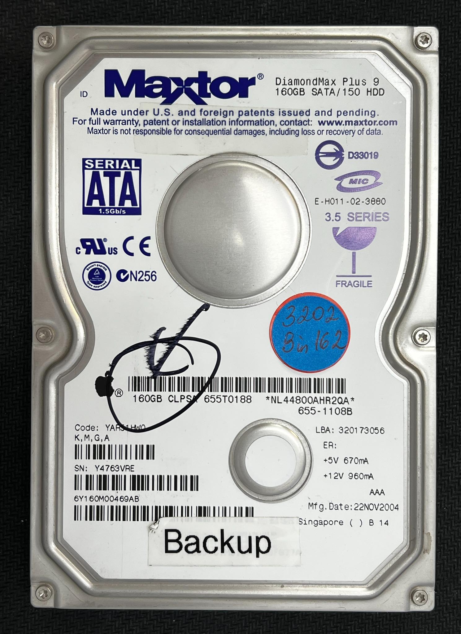 | Description | Full File Name: MAXTOR 6Y160M00469 Y4763VRE 2004-11-22 160GB HDD Model: 6Y160M00469 Full Model: Maxtor DiamondMax Plus 9 Series: DiamondMax Plus 9 Capacity: 160GB Interface: Ultra ATA/133 (IDE/PATA) Serial Number (S/N): Y4763VRE Part Number (P/N): YAR41H00 Firmware (FW): Unknown WWN: Unknown Manufacture Date (DOM): 2004-11-22 (22 November 2004) Site Code: Unknown (Made in Singapore) Power Specs: +5V 0.67A / +12V 0.96A Spindle Speed: 7200 RPM Drive Class: Desktop Cache: 8 MB (Typical for this model series) Notes: DCM: K,M,G,A; R/N: DiamondMax Plus 9; LBA: 320,173,056; PCB Code: Calypso PCB; Extra Notes: 'Backup' sticker on label. | Model: WD40NMZW-59GX6S1 Serial Number: WX41DA8PF35R Date: 23 November 2018 Product of: Malaysia PCB: 2060-800041-003 REV P1 Item #: 00003 Bin Location: 1 | Model: ST2000LM007 Serial Number: ZDZFAQ21 Part Number: 1R8174-570 Firmware: EB01 Date: 02 January 2021 Site Code: TK Product of: Thailand PCB: 100835923 REV A Item #: 00015 Bin Location: 2 | Model: WD50NDZM-59A8KS1 Serial Number: WX72D80K83EL Date: 26 October 2020 Product of: Made in Thailand PCB: 2060-810033-001 REV PO Item #: 00009 Bin Location: 1 | Model: ST2000LM007 Serial Number: ZDZ866TZ Part Number: 1R8174-568 Firmware: SBK2 Date: 04 September 2019 Site Code: TK Product of: Thailand PCB: 100815565 REV A Item #: 00013 Bin Location: 2 | Model: ST2000LM007 Serial Number: ZDZFNAP9 Part Number: 1R8174-570 Firmware: EB01 Date: 26 January 2021 Site Code: TK Product of: Thailand PCB: 100835923 REV A Item #: 00018 Bin Location: 2 |